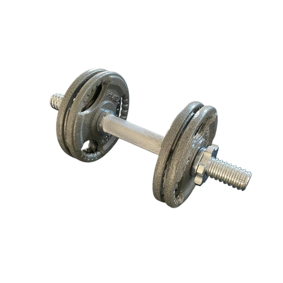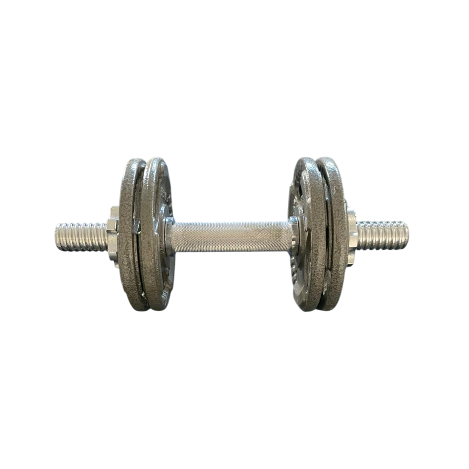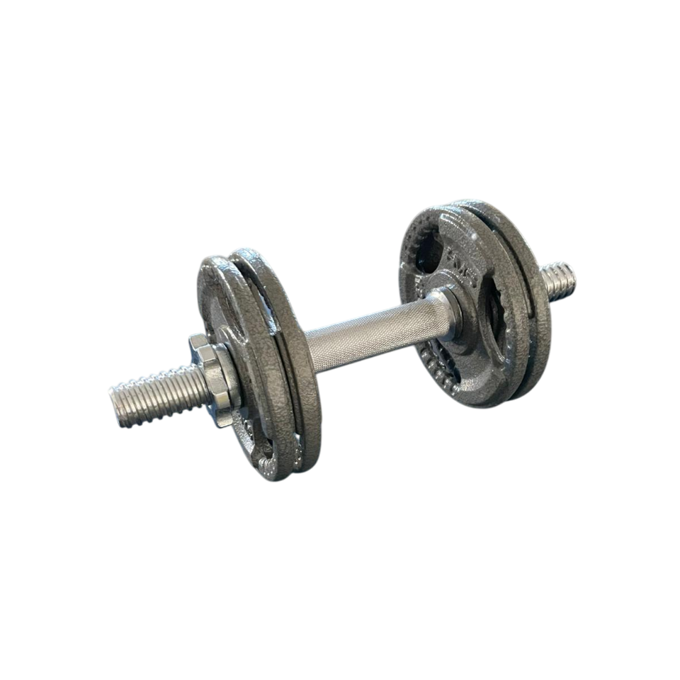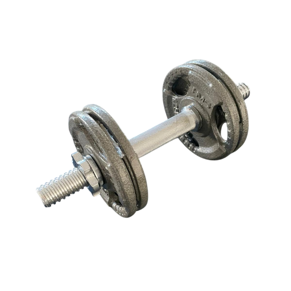 Jednoručni uteg 7 kg je podesiva bučica izrađena od visokokvalitetnih materijala (čelična šipka i utezi od lijevanog željeza s Hammertone premazom).